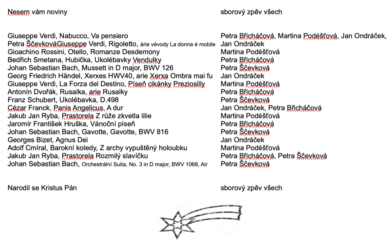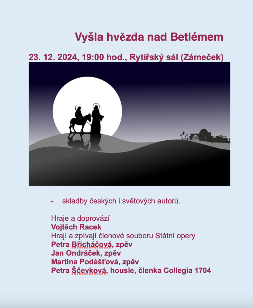 V pondělí 23. prosince se od 19:00 hodin v Rytířském sále Zámečku uskuteční tradiční koncert Vyšla hvězda nad Betlémem. Vystoupí členové souboru Státní opery: Petra Břicháčová, Jan Ondráček, Martina Podéšťová a Petra Ščevková, za doprovodu Vojtěcha Racka. Zazní řada koled a pastorel, které si budete moci zazpívat spolu s účinkujícími.