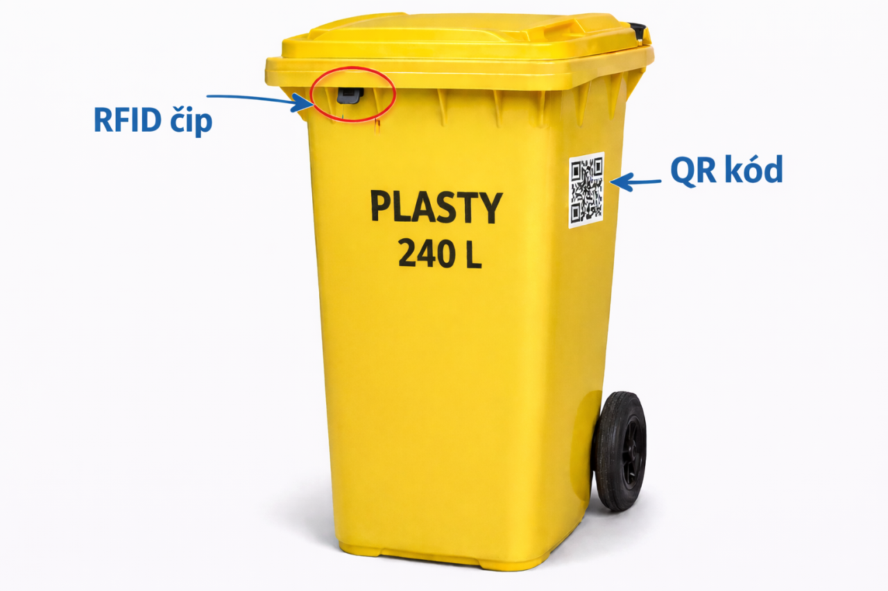– RFID čipem umístěným pod horním lemem nádoby v levé části (tmavě červený plastový kotouček).