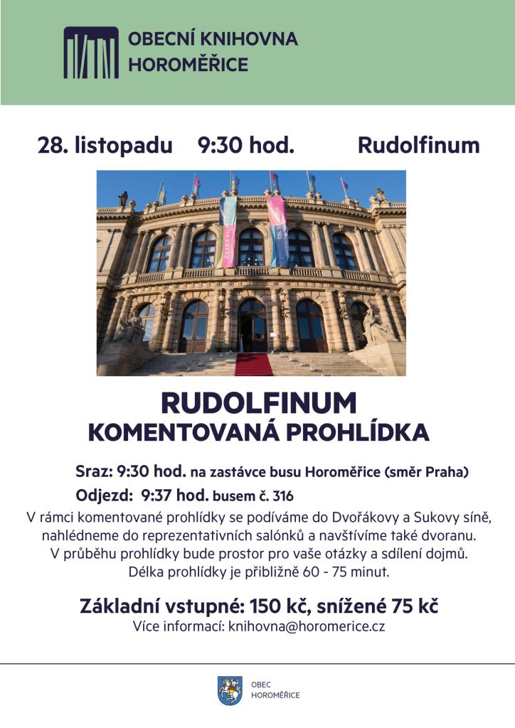 Dopoledne pořádá Obecní knihovna Horoměřice výlet do Prahy na komentovanou prohlídku významného kulturního centra Rudolfina. Sraz je v 9:30 hod. na autobusové zastávce Horoměřice (směr Praha). Odjezd autobusem linky 316 je naplánován na 9:37 hod.