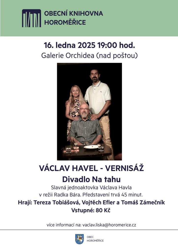 chtěli bychom Vás rádi touto cestou pozvat na zítřejší divadelní představení (čtvrtek 16. ledna 2025), které se odehraje od 19:00 hod. v Galerii Orchidea. Zavítá do ní Divadlo Na tahu, které si za desítky let svého fungování "vychovalo" již několik hereckých generací. Principálem je Andrej Krob, blízký přítel Václava Havla, který své divadlo profiloval především inscenováním her právě bývalého prezidenta. A do Horoměřic přivezou svou poslední novinku Vernisáž v režii Radka Bára.