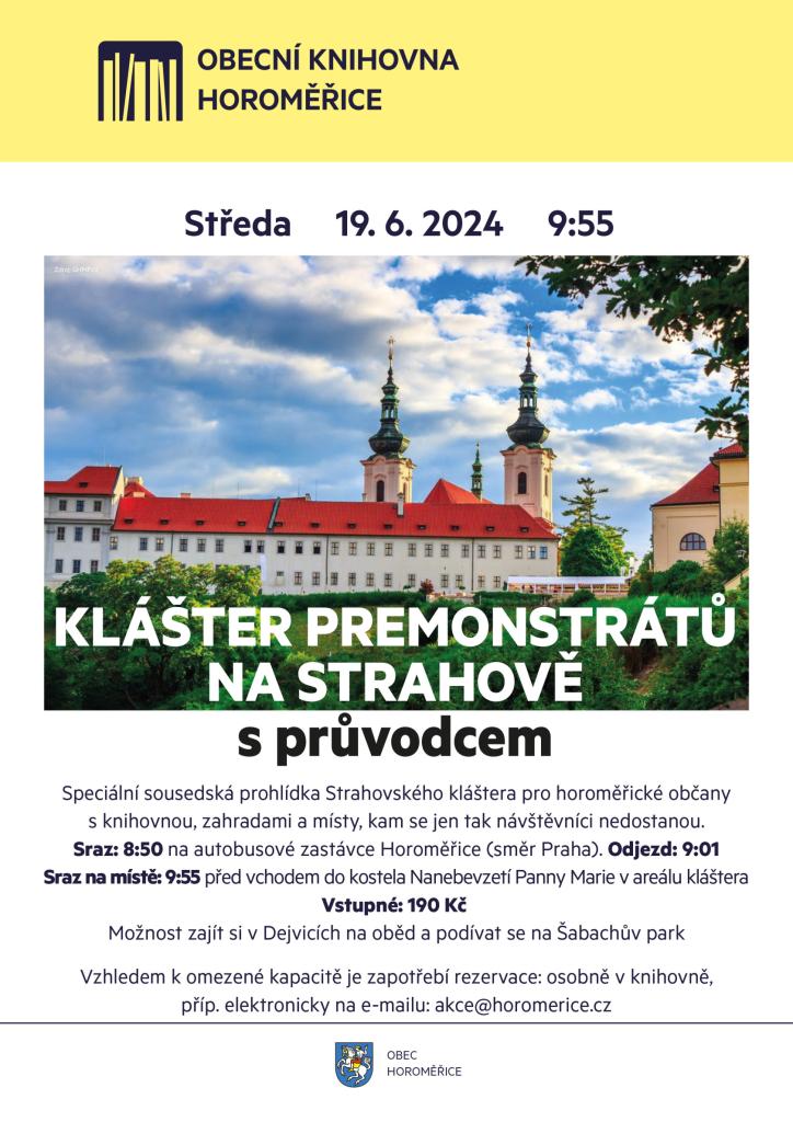 Obec Horoměřice s Obecní knihovnou Horoměřice Vás zve k prohlídce Kláštera premonstrátů na Strahově, která zahrnuje knihovnu, zahrady a místa, která nejsou návštěvníkům standardně přístupná. Vycházka proběhne příští středu 19. června.