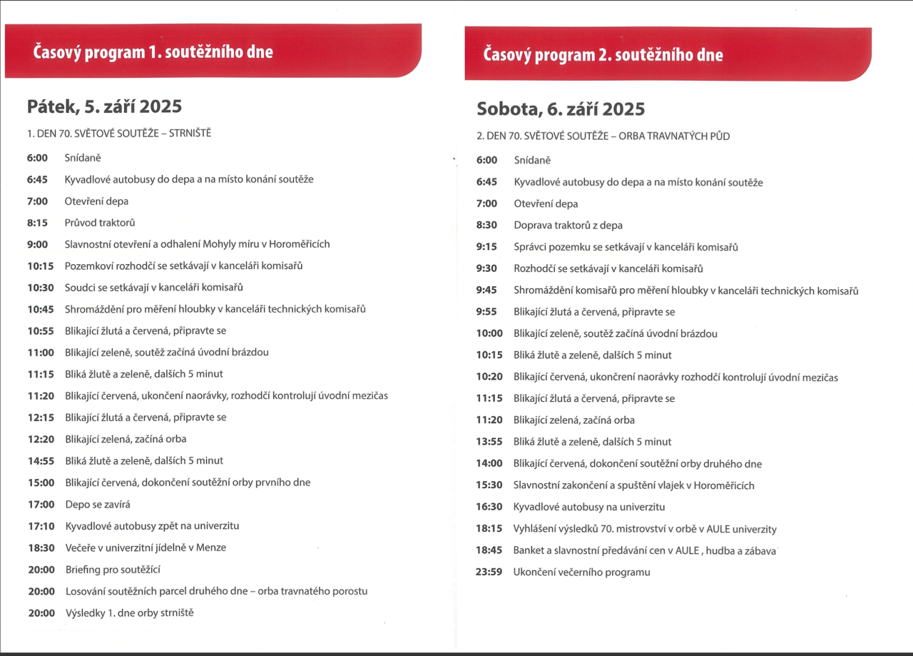 Návrat traktorů z polí do depa bude individuální v době cca od 15:00 hod. do 17:00 hod. Celý proces se bude opakovat i v sobotu 6. září. Kolona traktorů z depa vyjede v 8:30 hod. a návrat z pole opět individuálně cca od 14:00 hod. do 16:00 hod.