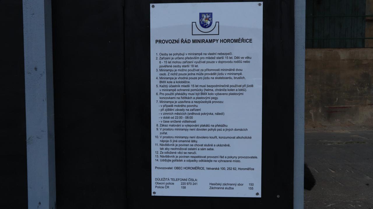 V Horoměřicích vzniklo nové sportoviště pro mládež, kterých bylo zatím poskrovnu. Díky financování obce jsme postavili minirampu vhodnou pro jízdu na skateboardech a koloběžkách. Rampa je navržena především pro začínající jezdce, ale svými parametry bude bavit i ty pokročilejší. Výška rampy je jeden metr s rádiusem o poloměru dva metry. Velkou předností je šířka čtyři a půl metru, která umožňuje provádět dlouhé slidy a grindy a dělá z naší rampy jednu z nejlepších v Praze a jejím okolí. Realizaci provedl profesionální snowboarder a zkušený stavitel Jakub Shymonkey Šimůnek, který má na svém kontě již mnoho projektů, za zmínku stojí legendární rampa v klubu D Eppl v Jablonci nad Nisou nebo rampa u přehrady v Hostivaři. Mimo jiné pracuje také na stavbách betonových skateparků pro firmu Betongpark v Norsku. Umístění na zámečku v blízkosti školy je naprosto ideální, především dobrou dostupností v centru obce. Výhodou je také přítomnost správce areálu. Uzavřený areál disponuje starší střechou, která naší novou minirampu ochrání před deštěm. Díky tomu mohla být použita překližka, která je pro požitek z jízdy nejlepší variantou. Zároveň byla nainstalována světla, díky nimž bude prostor osvětlen i během zimních večerů. Podařilo se nám tak přispět k žádanému oživení druhého nádvoří, kde doteď sídlily především provozy průmyslového charakteru. Uzavřený areál je vhodný i k pořádání doprovodných akcí jako jsou závody či koncerty, jak jsme se přesvědčili třeba díky sousedskému festivalu. Současné umístění je však jen dočasné dokud zámeček neprojde rekonstrukcí, pak by byla rampa přemístěna. Vzhledem k rozsahu a náročnosti oprav se však můžeme těšit na několik let příjemného svezení a doufat, že se v budoucnu podaří realizovat větší a trvalý skatepark na jiném vhodném místě.