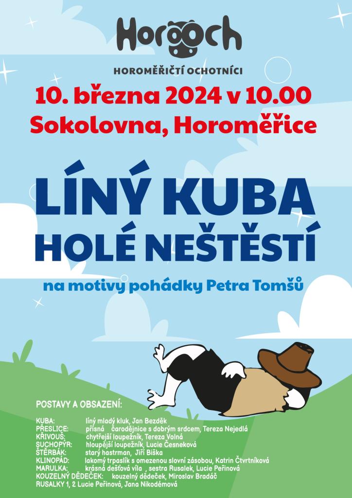 Tuto neděli 10. března od 10:00 hod. proběhne v místní sokolovně premiéra divadelního horoměřického ochotnického souboru HoroOch pohádky Líný Kuba, holé neštěstí. Tato pohádka vznikla na motivy pohádky Petra Tomšů a můžete se těšit na plno známých horoměřických tváří.