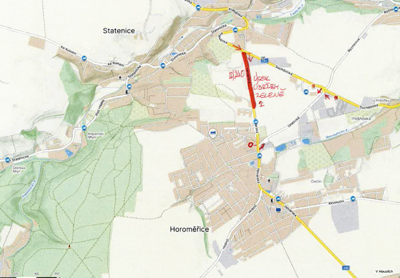 Jedná se o bezpečnostní a zdravotní řez stromů na žádost KSÚS. Vzhledem k místní problematice a přístupům k porostu, je nutné maximálně zabezpečit bezpečnost ostatních účastníků provozu a i samotných pracovníků. Z tohoto důvodu bude ve výše uvedených dnech a časech provoz z této komunikace odkloněn dle přiloženého nákresu, po komunikaci III/2411 a II/241. V tomto úseku bude umožněn, za zvýšené opatrnosti, průjezd pouze linkových autobusů a vjezd rezidentů k jejich domovům.