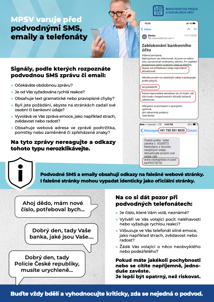 chtěli bychom Vás informovat, že se Ministerstvo práce a sociálních věcí a další státní instituce již delší dobu potýkají s problémem tzv. phishingových útoků. Občanům chodí podvodné sms a e-maily, které se tváří jako informace od státu. Tyto zprávy pak odkazují na falešné webové stránky. Falešné webové stránky se snaží nalákat občany k poskytnutí citlivých osobních či bankovních údajů, jejichž zneužitím by útočníci mohli získat kontrolu například nad jejich bankovním účtem. Některé podvodné stránky působí velmi věrohodně, neboť grafická úprava těchto stránek napodobuje stránky MPSV, ČZZS nebo Identity občana a dalších institucí.