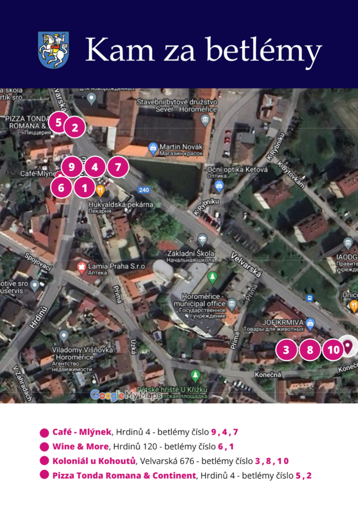 - Navštivte místní podniky, kde jsou betlémy vystaveny - Café-Mlýnek, Wine & More, Koloniál u Kohoutů, Pizza Tonda Romana & Continent (mapa podniků s betlémy je přílohou).