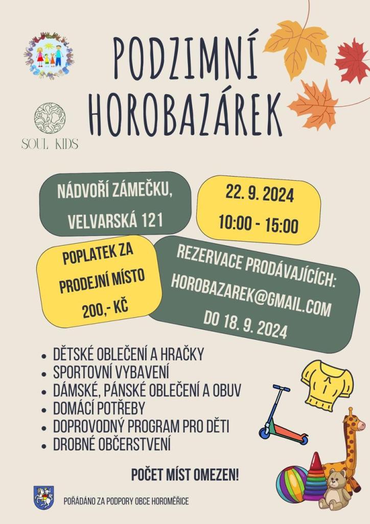 následující víkend je opravdu nabitý a krom voleb, cyklistických závodů a akce na Letišti můžete v neděli 22. září zavítat na horoměřický Zámeček, na jehož nádvoří se bude konat charitativní Podzimní Horobazárek. Ten společně pořádají RK Pohoda a lesní školka Soul Kids a i Vy se můžete stát oučástí této akce, která se bude konat od 10:00 hod. do 15:00 hod. Můžete prodávat i nakupovat.