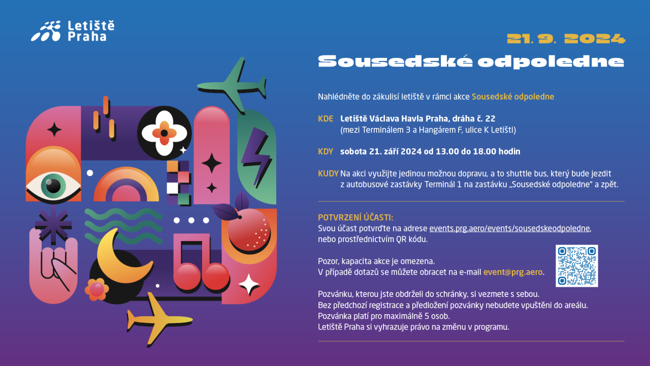 Letiště Praha zve občany z blízkého okolí na Sousedské odpoledne, při kterém se bývalá ranvej promění v zábavný park. Kromě bohatého zábavného programu nabízí i možnost zeptat se letištních expertů na cokoliv z leteckého provozu i budoucího rozvoje. Vstup je možný jen s pozvánkou, které byly distribuovány přímo do poštovních schránek, a po registraci na odkazu ZDE.