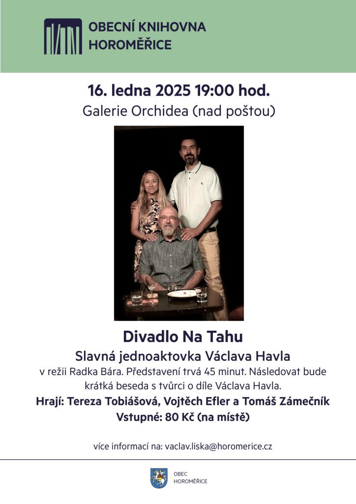 Do naší obce zavítá legendární divadelní soubor Divadlo Na tahu se svou nejnovější inscenací, a to slavnou jednoaktovkou Vernisáž od Václava Havla. Jak může dopadnout návštěva kamaráda u manželského páru, který se chce pochlubit zrekonstruovaným "bejvákem"?