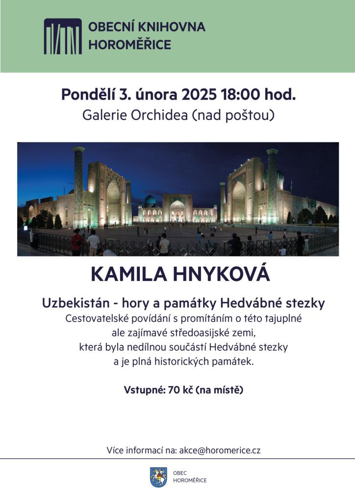 UZBEKISTÁN - cestovatelská přednáška Kamily Hnykové, 3. 2., 18:00 hod., Galerie Orchidea