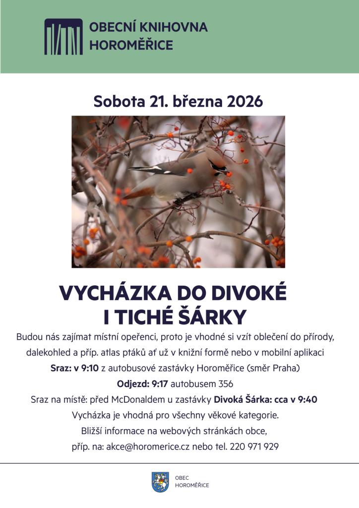 Jedná se o nenáročnou vycházku v blízkosti Horoměřic pro všechny zájemce o pozorování ptactva. Sraz bude tradičně na autobusové zastávce Horoměřice (směr Praha) v 9:10 hod. a dále se pojede tramvají do zastávky Divoká Šárka, kde je sraz s p. Kulhánkem a příp. dalšími zájemci o vycházku.