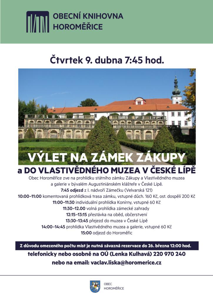 Obec Horoměřice pořádá ve spolupráci s Univerzitou 3. věku celodenní poznávací zájezd na státní zámek Zákupy a do Vlastivědného muzea a galerie v bývalém Augustiniánském klášteře v České Lípě. Tento výlet se bude konat ve čtvrtek 9. dubna a z I. nádvoří Zámečku (Velvarská 121) se pojede v 7:45 hod. Očekávaný návrat bude kolem 16:30–17 hod.