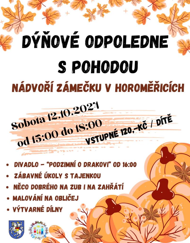 RD Pohoda vás zve od 15:00 do 18:00 hod. na již 9. ročník Dýňování - na pohodové odpoledne s dětmi, které vždy svýma šťastnýma očima rozzáří nádvoří horoměřického Zámečku. Nebude chybět divadelní představení Divadla Úsměv s pohádkou “Podzimní o drakovi”. Svou zručnost si děti budou moci prověřit v dílničce, kde si vyrobí vlastní lucernu. Mohou se těšit i na oblíbené malování na obličej. K dispozici bude drobné občerstvení, tradiční dýňová polévka a tematické dobroty. Přijďte se se svými ratolestmi naladit do pohody.