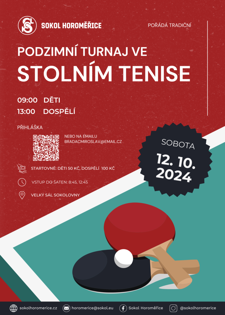 T.J. Sokol Horoměřice Vás zve na tradiční turnaj pro širokou veřejnost ve stolním tenise. Dopoledne (od 9:00 hod.) proběhne soutěž dětí a mládeže a po poledni (13:00 hod.) začne turnaj dospělých.