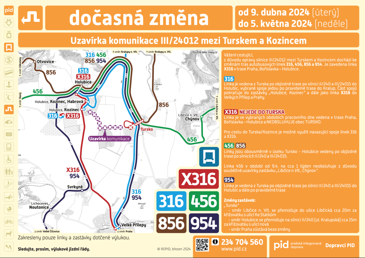 chtěli bychom Vás touto cestou informovat, že od úterý 9. 4. 2024 do 5. 5. 2024 dojde ke změnám na linkách 316, 456, 856 a 954. Zavedena je linka X316 v trase Praha, Bořislavka - Holubice. To vše z důvodu opravy silnice III/24012 Tursko-Kozinec.