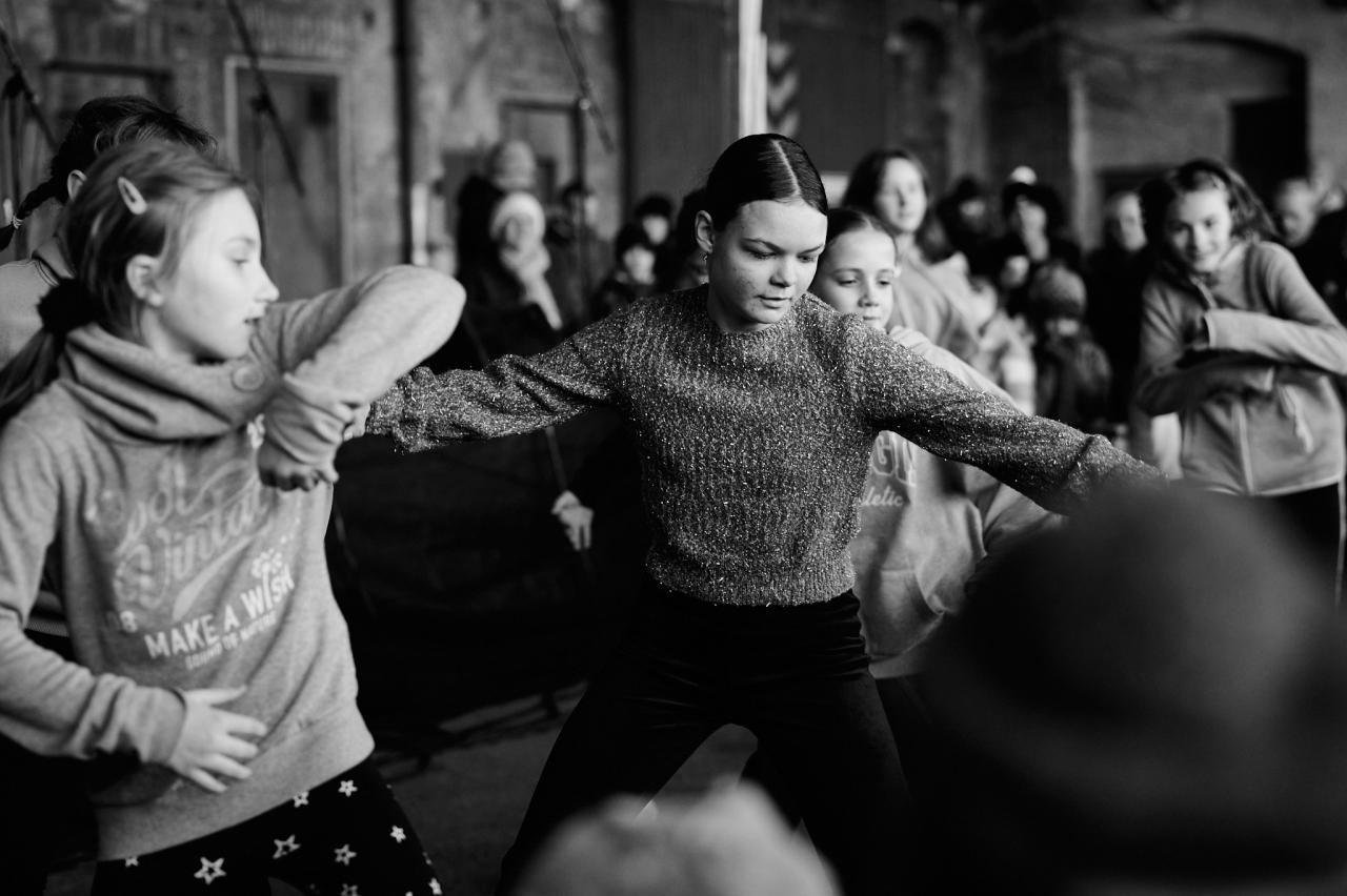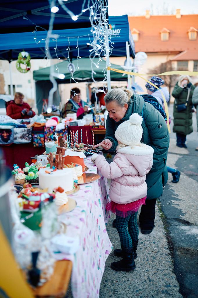 Odpolední slunce brzy ustoupilo mrazu. Návštěvníky však rozehřála vystoupení Dance Crew Horoměřice vedené Eliškou Neugebauerovou. Její tři taneční skupiny dívek rozproudily atmosféru a rozpohybovaly rodiče a další přihlížející. Následovala zvuková zkouška kapely Cukr, a tak mnozí korzovali po nádvoří a ochutnávali různé druhy svařáků, který byl letos v nabídce prakticky každého stánku. V těch si mohli vybírat z vánočních dekorací a produktů - ať už jednalo o dekorace vyrobené technikou decoupage (ubrousková technika), patchworkové ozdoby a vychytávky, prkýnka a vánoční věnce, nebo výrobky dětí z místních MŠ a ZŠ, či produktů Svazu tělesně postižených v Lounech.