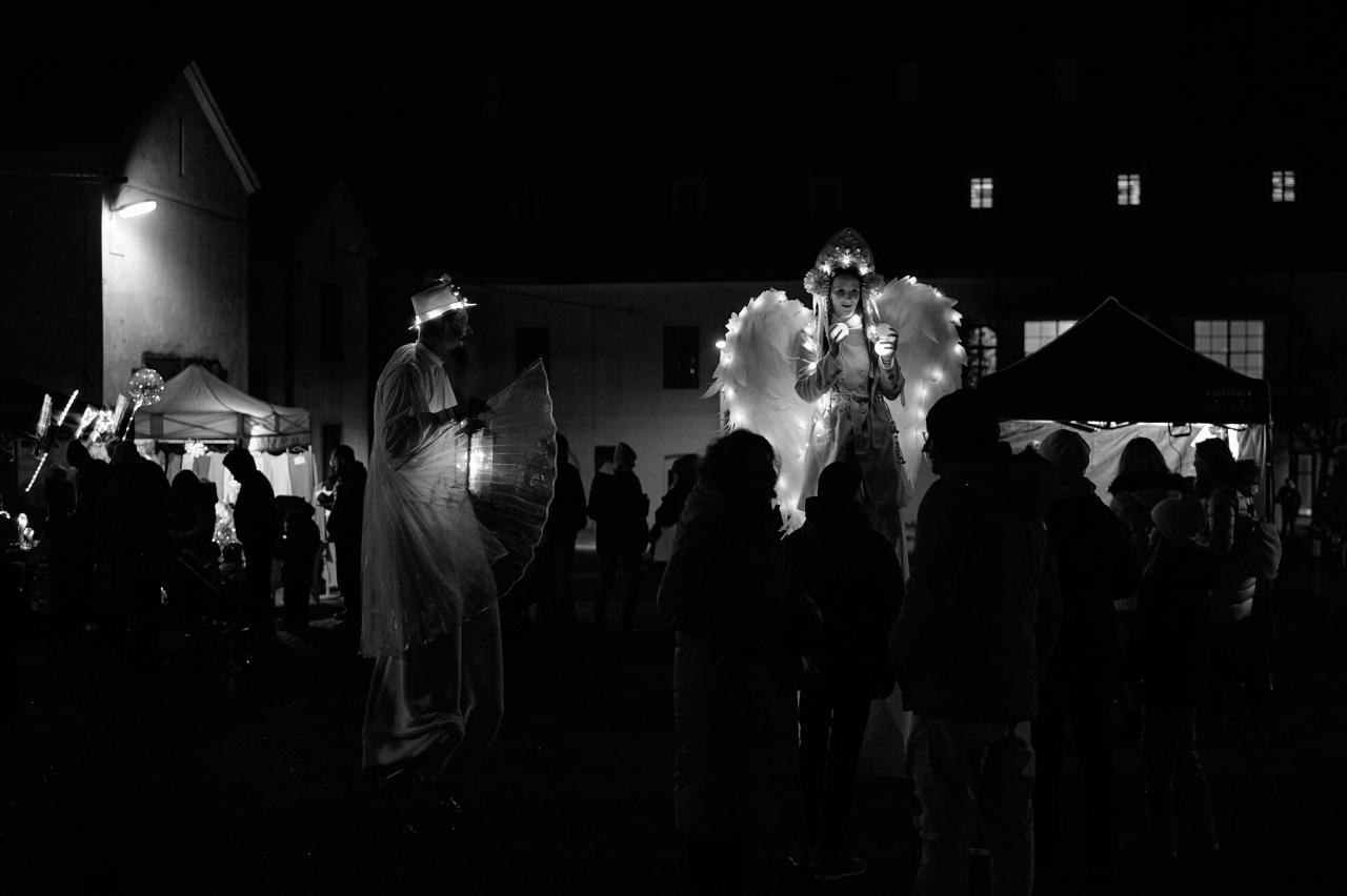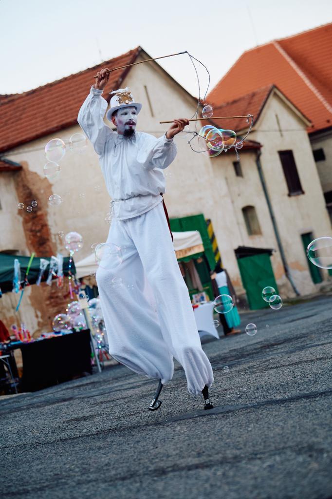 Po krátkém koncertu kapely Cukr vystoupilo duo andělů na chůdách Živa Poppy Theatre se svou interaktivní performancí. Dvojice předvedla své žonglérské umění, do kterého zapojila i přihlížející. Ač jejich první vystoupení chvilku kolidovalo s vystoupením horoměřických ochotníků ze spolku HoroOch, našlo si na jejich pohádku Kouzelný meč do Rytířského sálu cestu tolik diváků, že jej zcela zaplnili. Poté následovala druhá komentovaná prohlídka Zámečku.