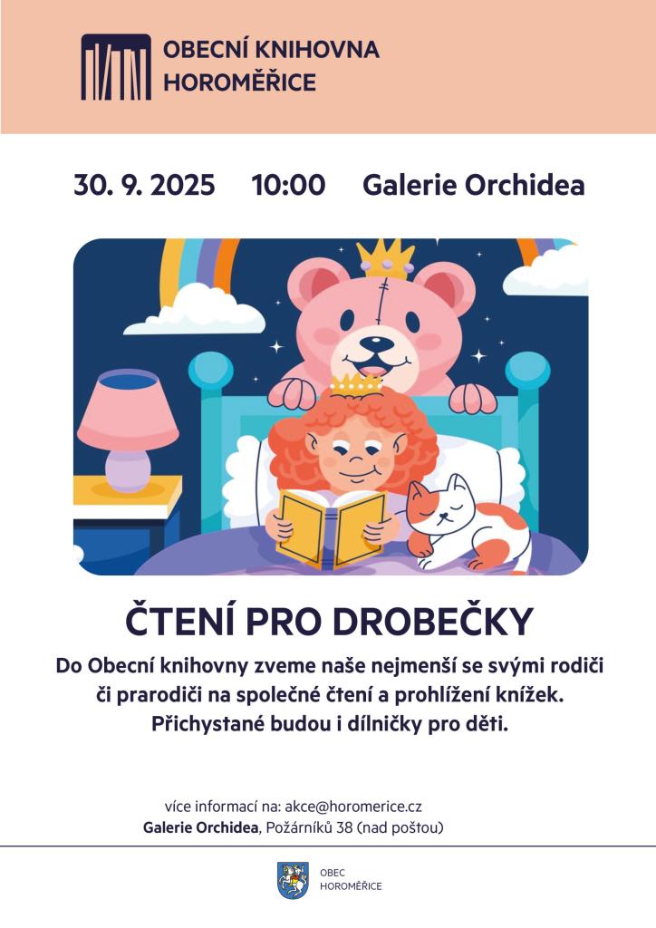 Oblíbená akce Obecní knihovny Horoměřice pro naše nejmenší s rodiči či prarodiči, kdy si společně čteme a prohlížíme knížky. Připraveny jsou i dílničky pro děti.