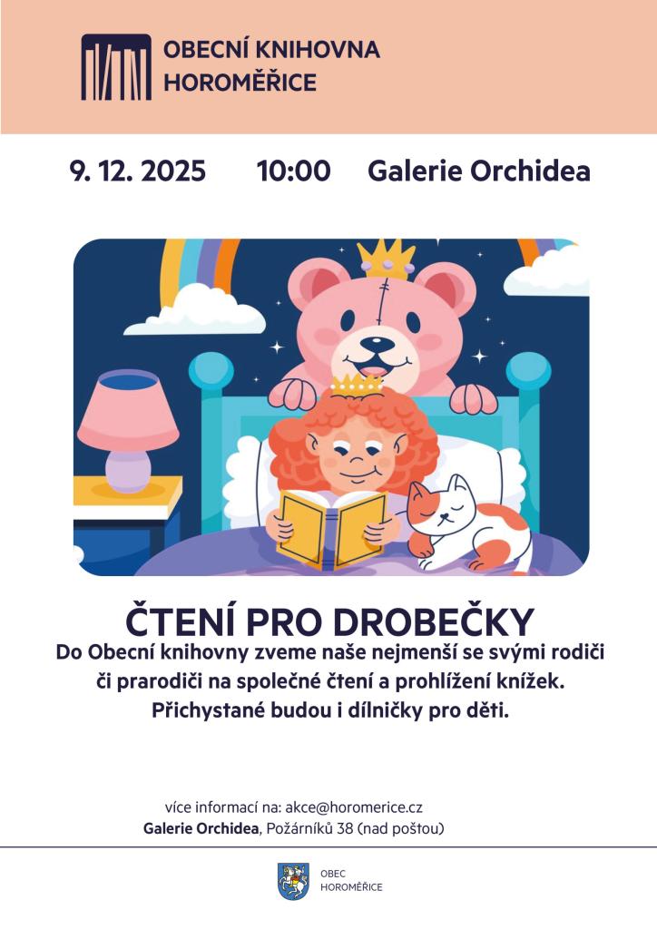 Oblíbená akce Obecní knihovny Horoměřice pro naše nejmenší s rodiči či prarodiči, kdy si společně čteme a prohlížíme knížky. Připraveny jsou i dílničky pro děti.