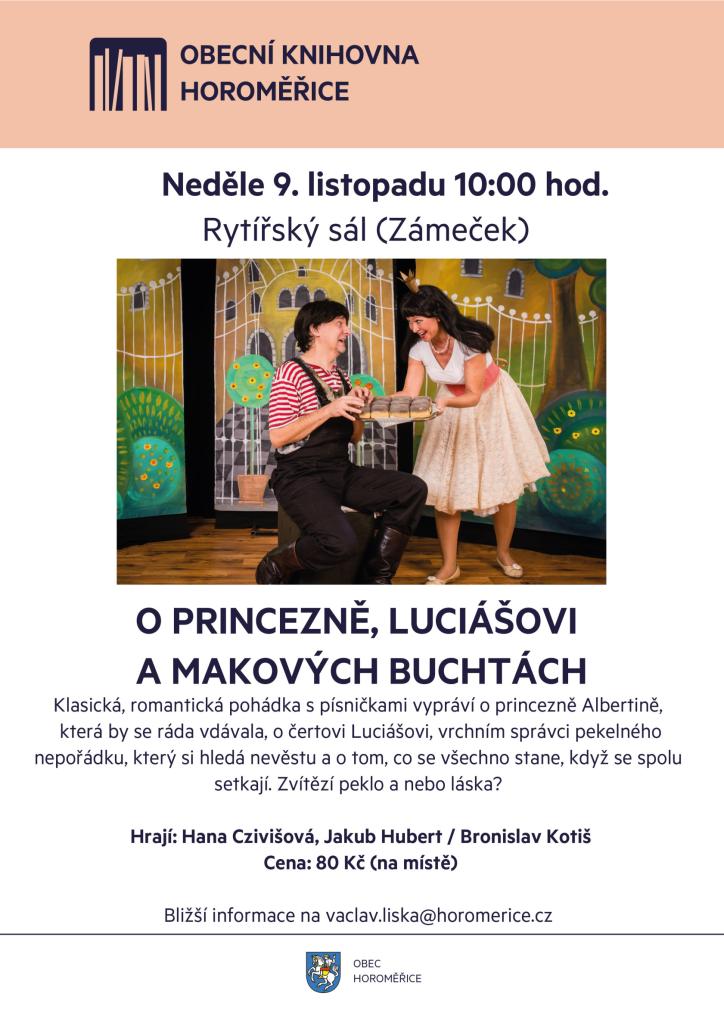 CziDivadlo přiváží do Horoměřic pohádku, která vypráví o princezně Albertině, která by se ráda vdávala, o čertovi Luciášovi, vrchním správci pekelného nepořádku, který si hledá nevěstu a o tom, co se všechno stane, když se spolu setkají. Zvítězí peklo a nebo láska?