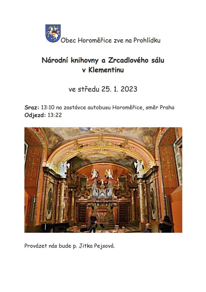 Horoměřická knihovna pod vedením Katrin Čtvrtníkové zve ke speciální prohlídce Klementina. Společně navštívíme Národní knihovnu a Zrcadlový sál Klementina, dozvíme se něco o historii a současnosti tohoto objektu a průvodkyní bude paní Jitka Pejsová.