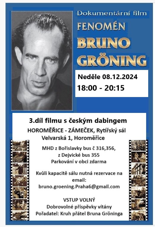 Klub přátel Bruna Gröninga Vás zve na dokumentární film, který se zabývá poslední částí života léčitele Bruno Gröninga. Jde o částečně hraný film, kde jsou zařazeny i výpovědi svědků doby.